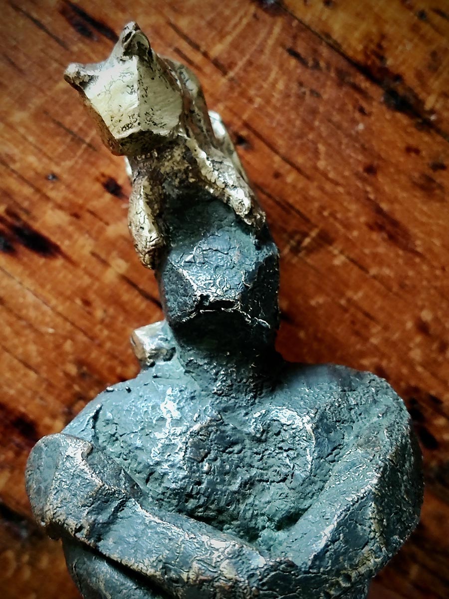 Gegossen im Urgussverfahren wie vor ca. 5.000 Jahren, mit verlorener Form. Das bedeutet, dass die Wachsvorlage bei dem Herstellungsprozess verloren geht. Die Wachsform wird mit Tonerde die mit Stroh vermengt wurde „eingepackt“. Dann wird das Wachs beim Brennen der Tonform geschmolzen und gibt so den Hohlraum frei, in den später die Bronze gegossen wird. zum brennen des Tons und erhitzen der Bronze kam uns ein neuzeitlicher Gasbrenner, ein Ventilator und etwas Schmiedekohle zu Hilfe.