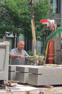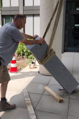 Der Steinmetz lädt die zugeschnittenen Stelen ab und stellt sie präzise an Ort und Stelle.
