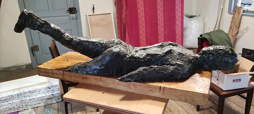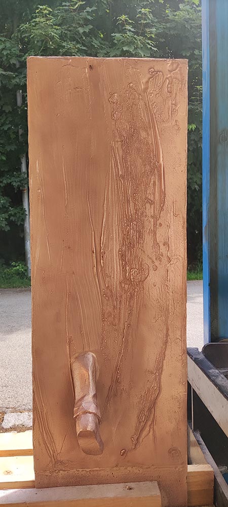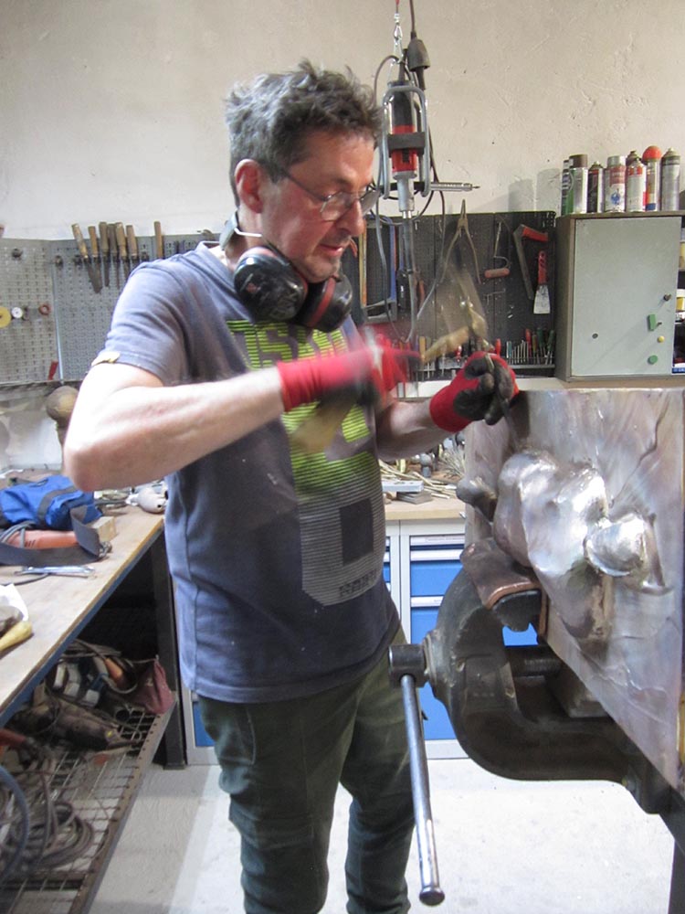 Aufwändige Nachbearbeitung der Skulptur mit Flex, Fräser, Hammer und Meisel, Punzeisen … und Patina.