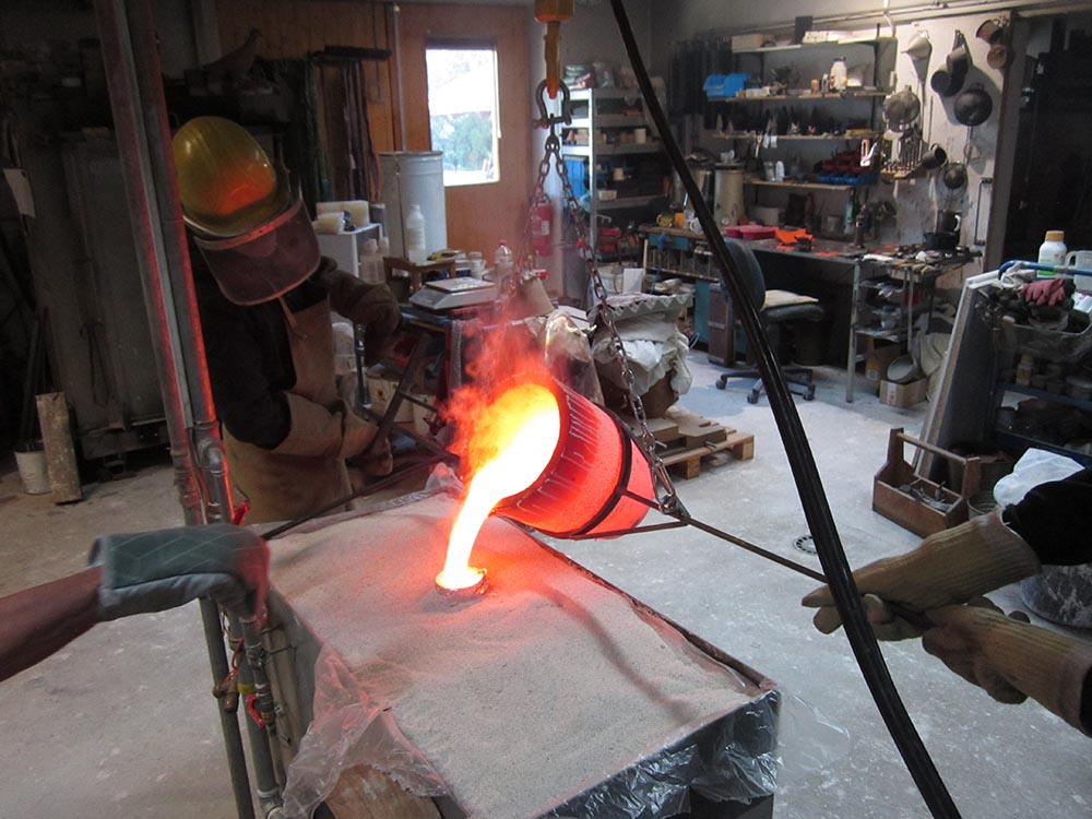 Der Guß ist der alles entscheidende Moment. Die Vorarbeit bis dahin steht bei der verwendeten Technik mit verlorener Form auf dem Spiel. Das Wachspositiv und die Keramikform sind unwiderbringlich verloren.